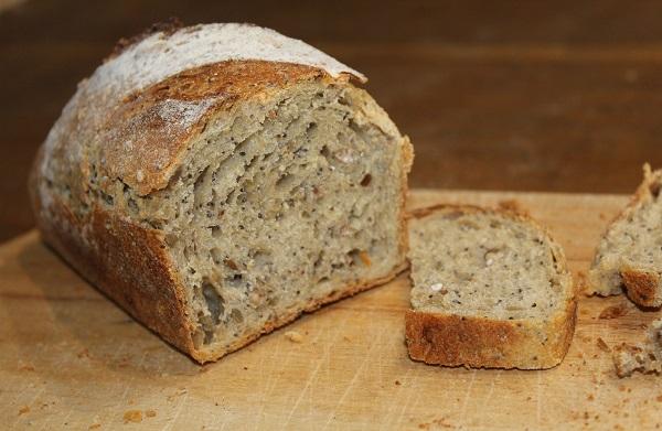 Pain aux graines (sésame, pavot, sarrasin et tournesol) moulé d'environ 550 g, au levain, pétri à la main et cuit au four à bois.
