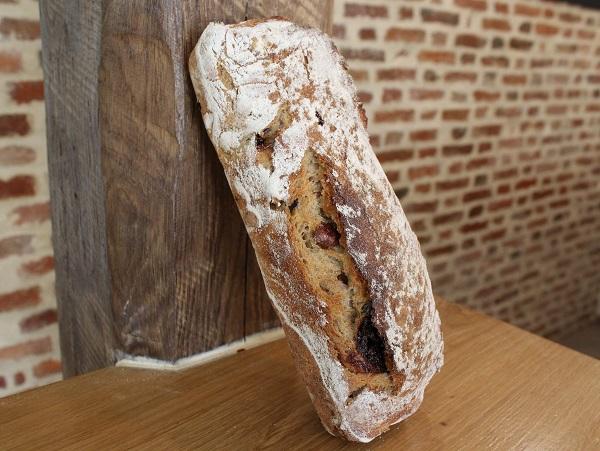 Pain moulé aux pruneaux, noisettes et miel d'environ 740g, au levain, pétri à la main et cuit au four à bois.