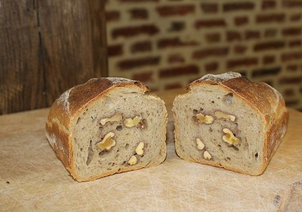 Pain nature bio moulé aux noix d'environ 690 g, au levain, pétri à la main et cuit au four à bois.